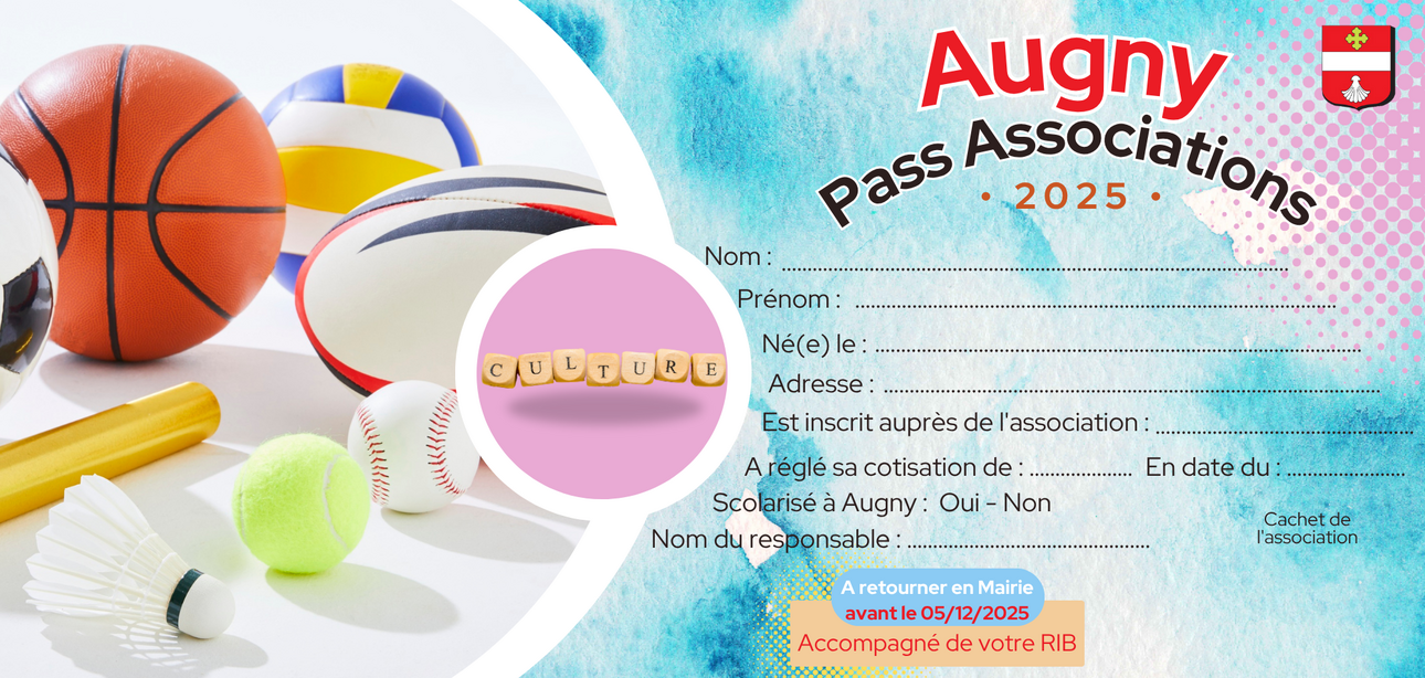 La commune d’Augny renouvelle son dispositif A.P.A. (Augny Pass Association) pour la saison 2025-2026. Il s’agit d’une aide financière de 30 € par enfant et par saison pour le paiement d’une licence ou cotisation auprès d’une association aunéenne (sport, culture, loisirs).